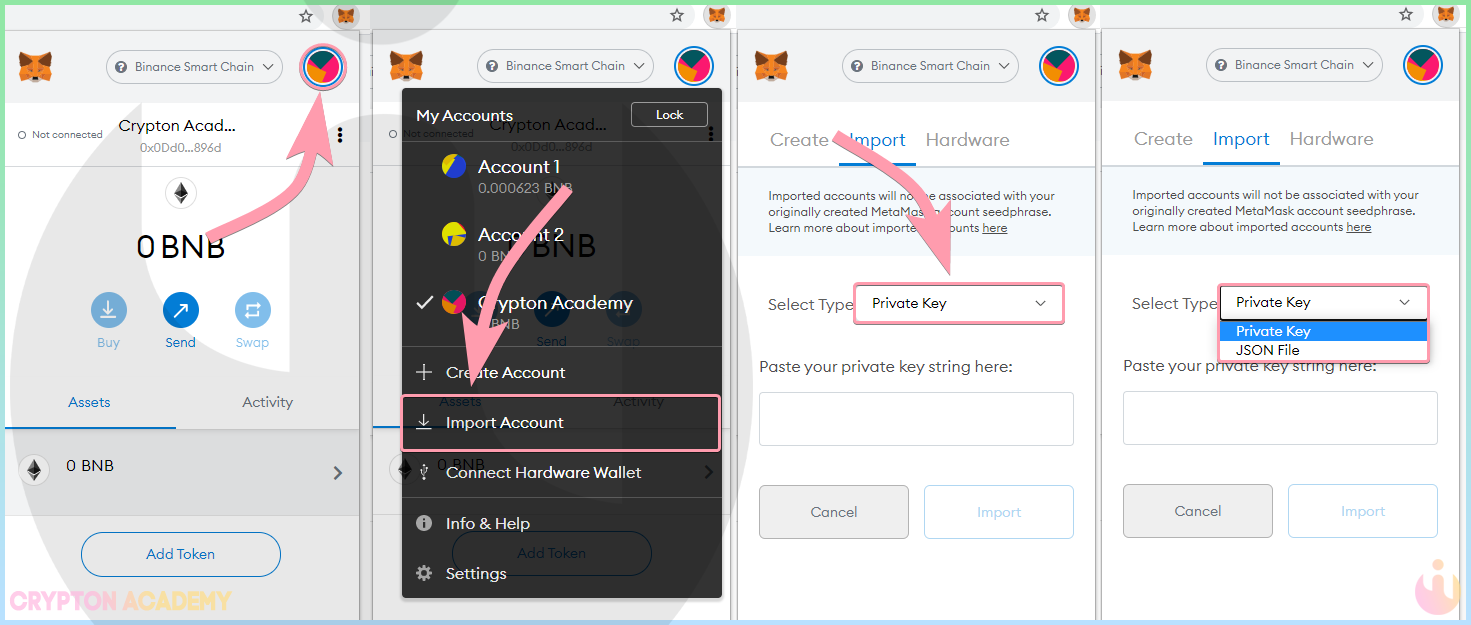 Существует две опции импорта дополнительного кошелька: через приватный ключ и через json-файл. О том, что это, я расскажу сразу после того, как покажу ряд действий для импорта