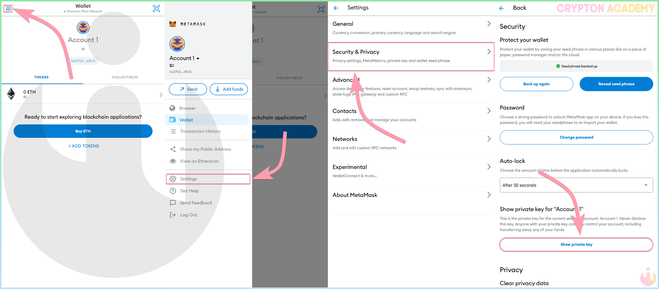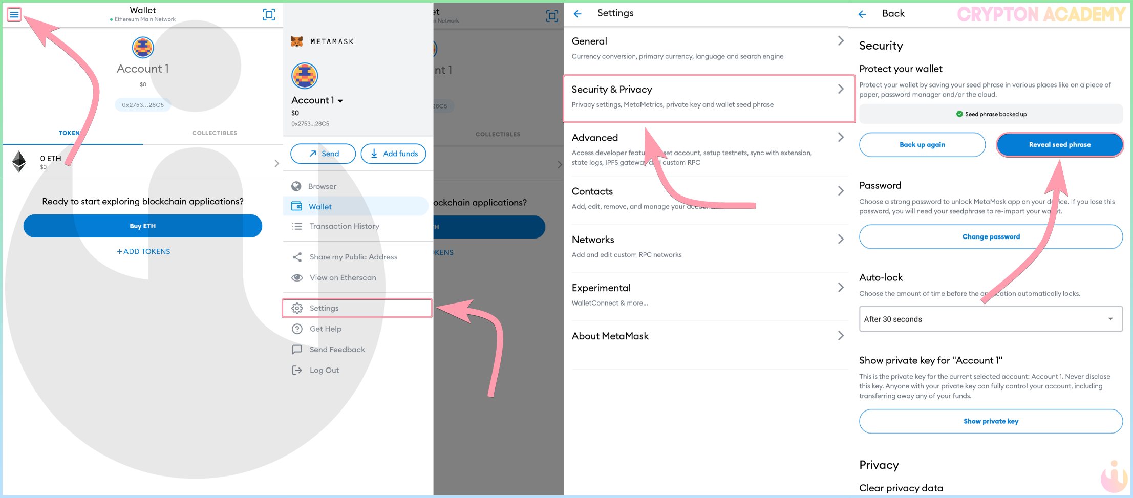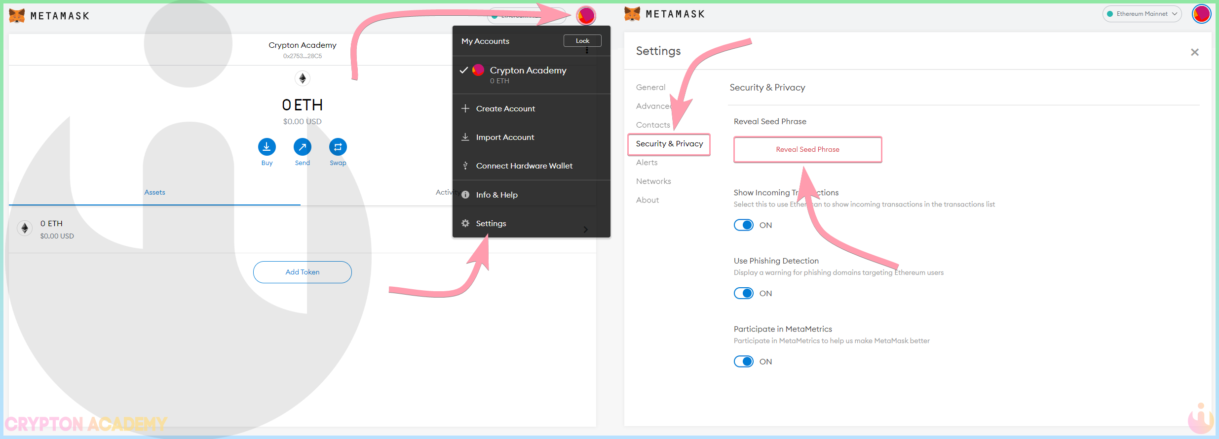 Откройте Опции, перейдите в Settings, во вкладку Security & Privacy и нажмите Reveal Seed Phrase: