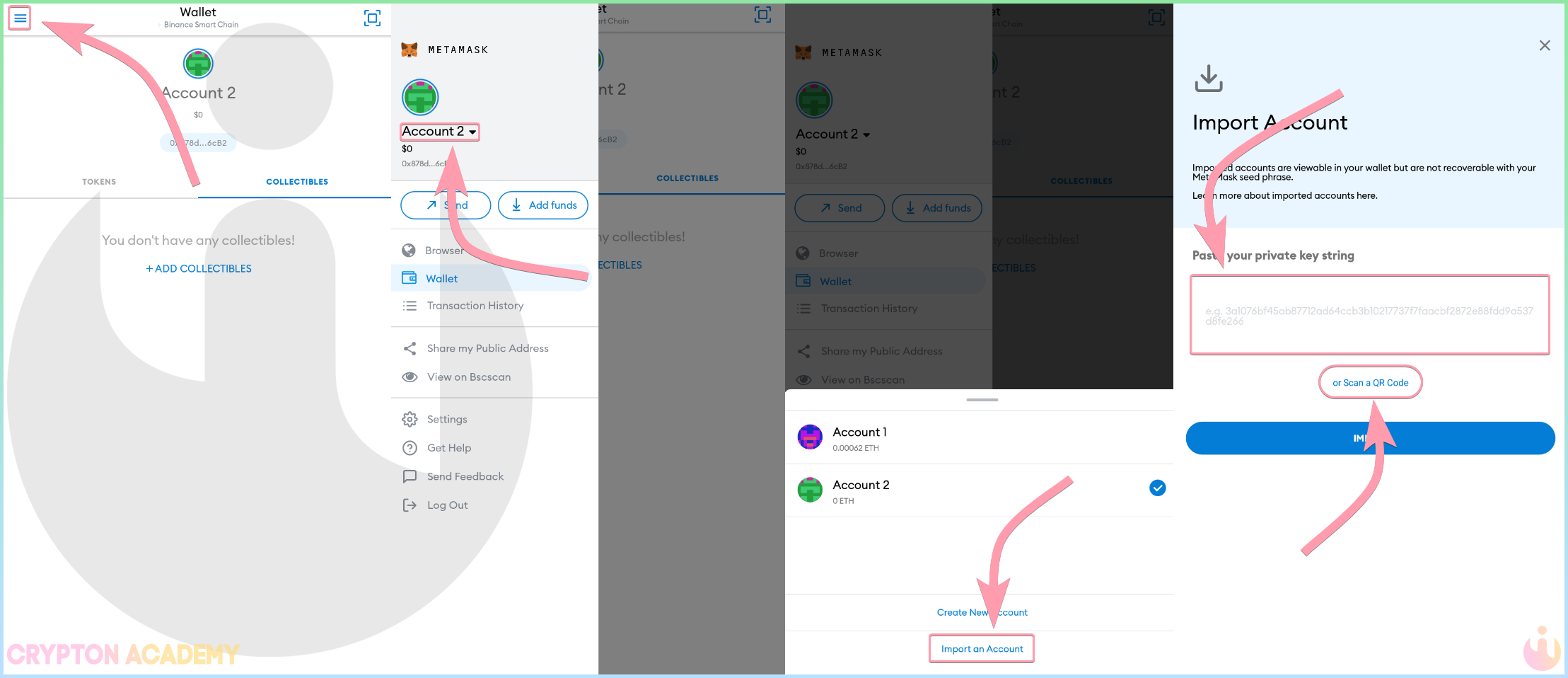 Перейдите в Опции, нажмите на имя текущего кошелька, далее выберите Import an Account и введите ваш приватный ключ или просканируйте QR-код, содержащий приватный ключ: