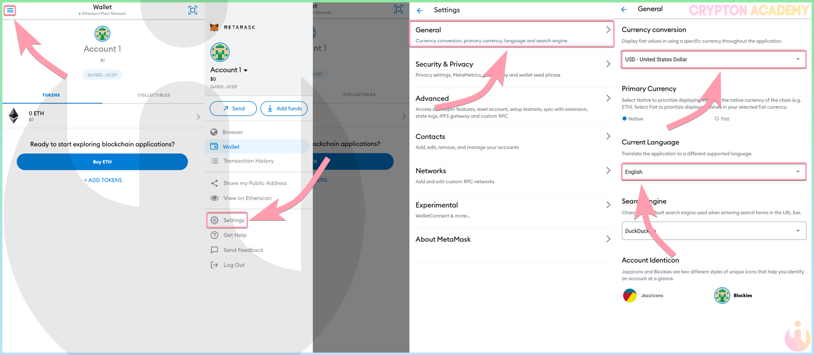 В этом пункте разберем изменение языка, валюты и отображения профиля кошелька.