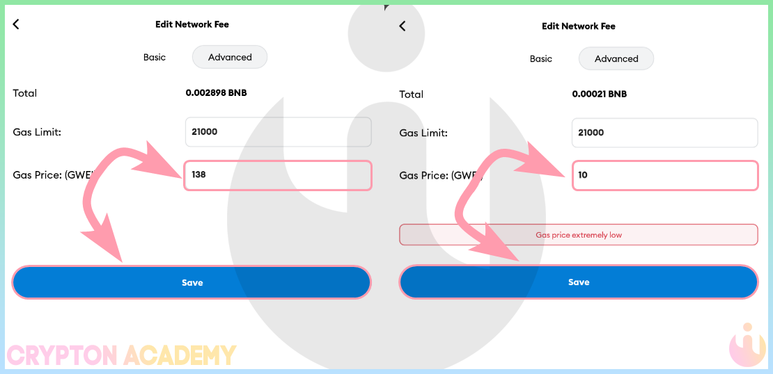 • Вписав сумму для отправки нажмите Next, далее идет важный шаг, если Вы отправляете токены в сети Binance Smart Chain. На момент написания статьи в приложении присутствует баг, из-за которого автоматически подставляются комиссии из сети Ethereum, поэтому для того, чтобы не тратить лишние средства на комиссию. Для изменения комиссии нажмите Edit в блоке комиссий и Advanced во всплывшем окне: