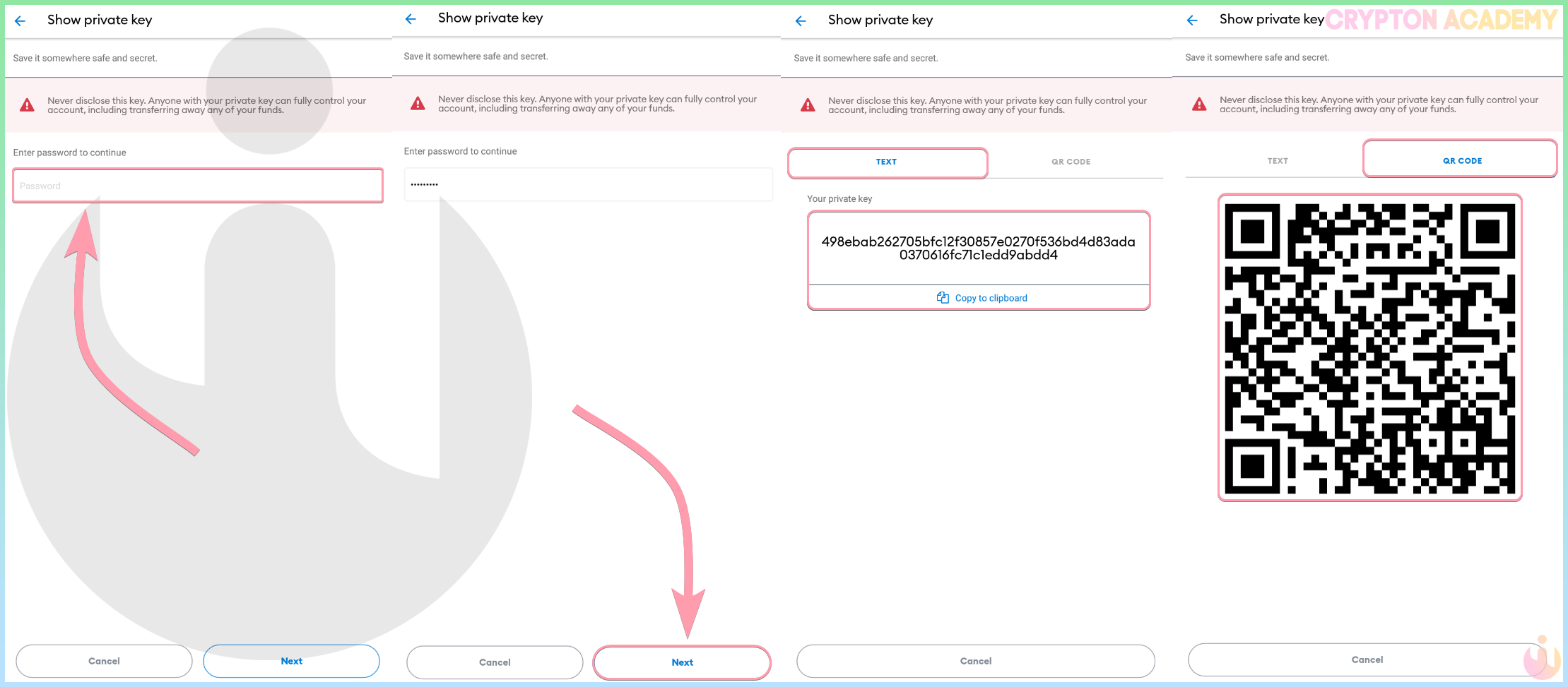 Процесс аблолютно аналогичен экспорту seed-фразы, только на последнем шаге нужно выбрать Show private key: