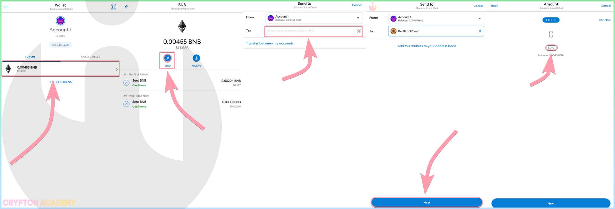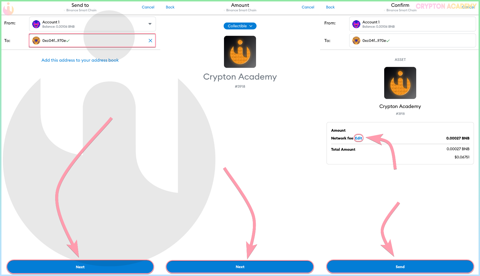Выберете токен и нажмите Send, далее укажите адрес получателя и нажмите Next: