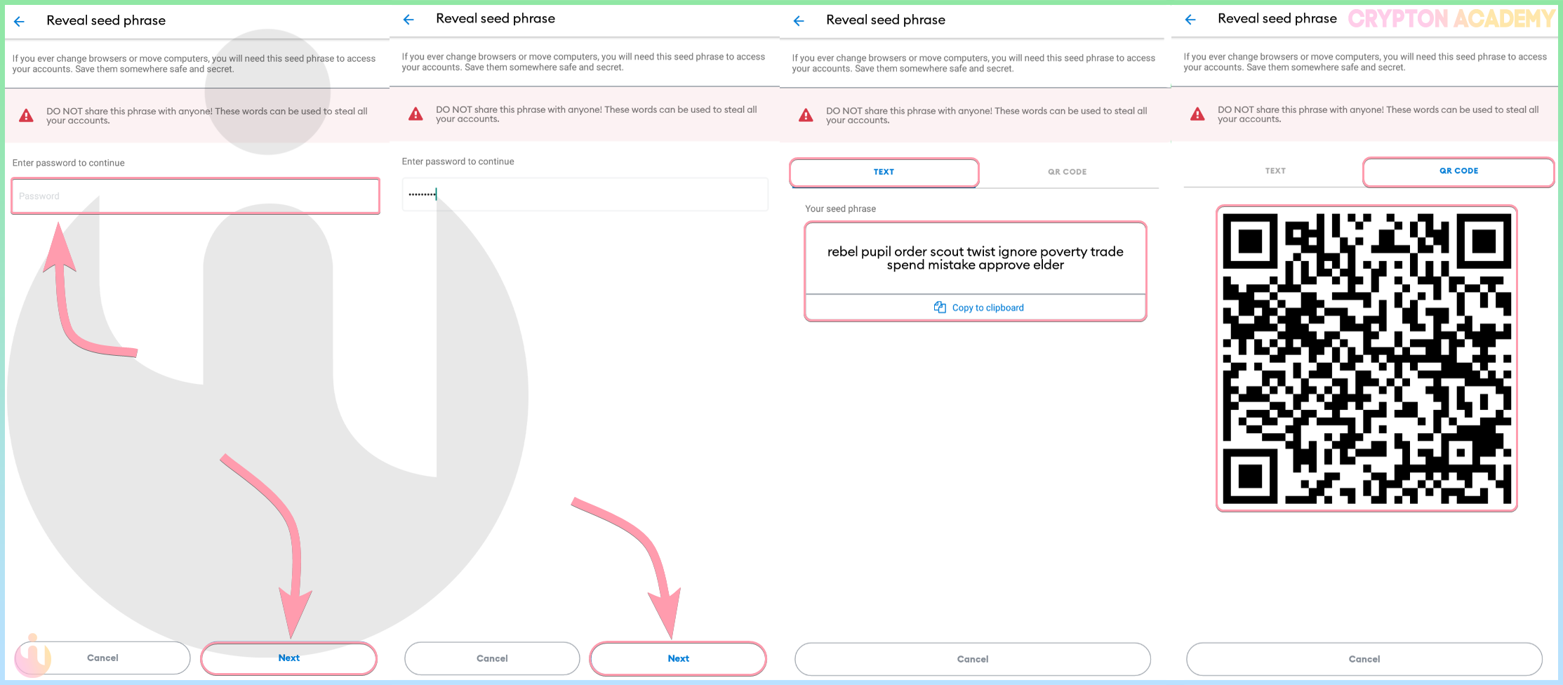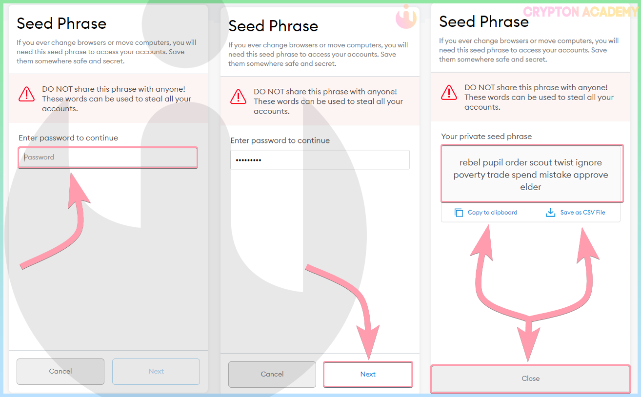 Вы можете экспортировать seed-фразу, скопировав её, или скачав в виде CSV-файла (по сути это просто текстовик, который Вы можете открыть в любом редакторе). Но я настоятельно рекомендую Вам не делать ничего из предложенного, намного безопаснее будет воспользоваться каким-либо из советов из нашей статьи «Как правильно хранить Вашу SEED-фразу?»