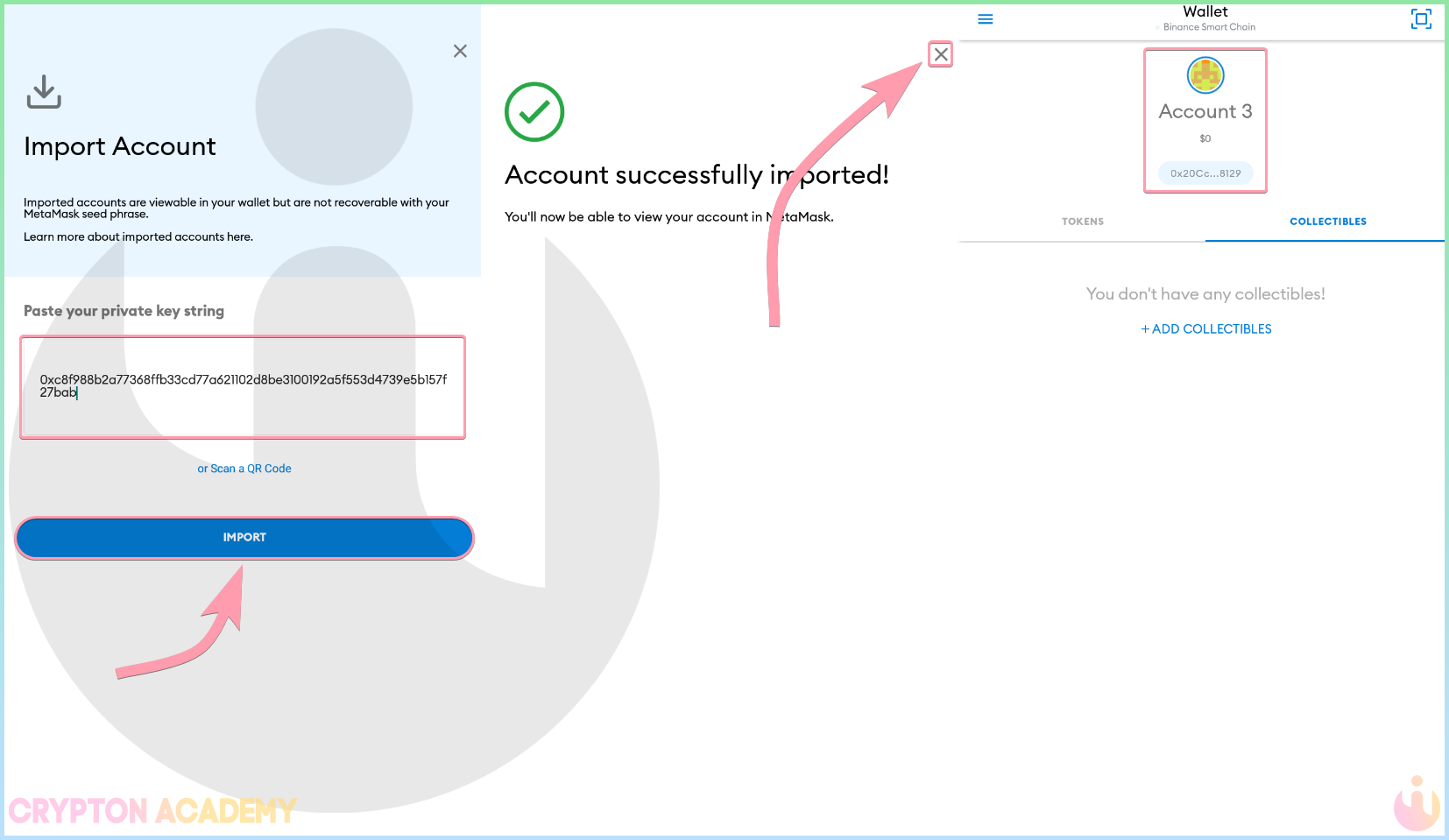 Я буду импортировать кошелек при помощи приватного ключа, поэтому выбираю эту опцию импорта, ввожу приватный ключ и жму Import: