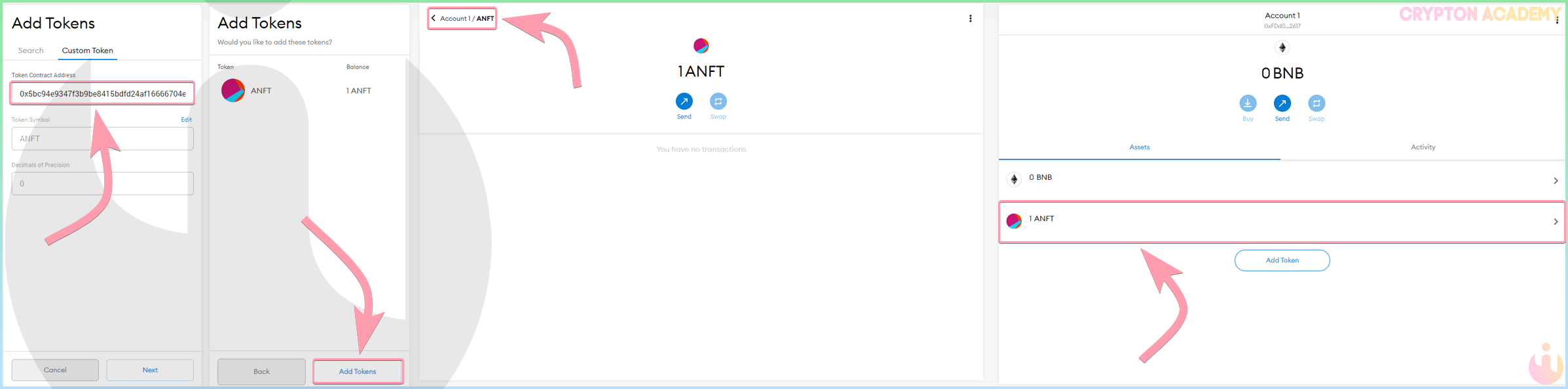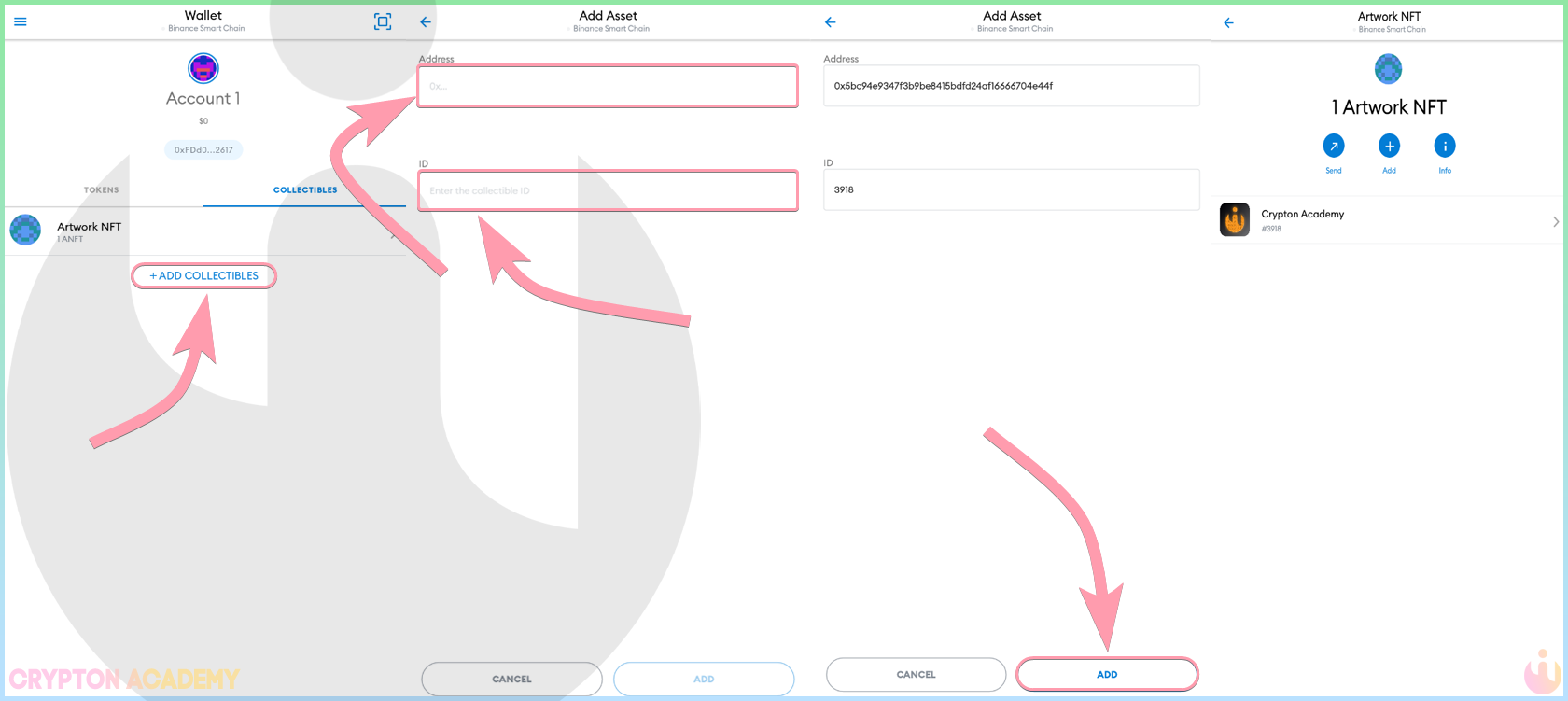 Процесс добавления абсолютно такой же, как и при работе с обыкновенными [не nft] токенами, выглядеть это будет, конечно, несколько необычно: