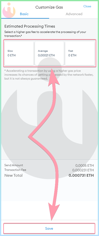 Для ускорения транзакции выберите комиссию или впишите комиссию вручную во вкладке Advanced: