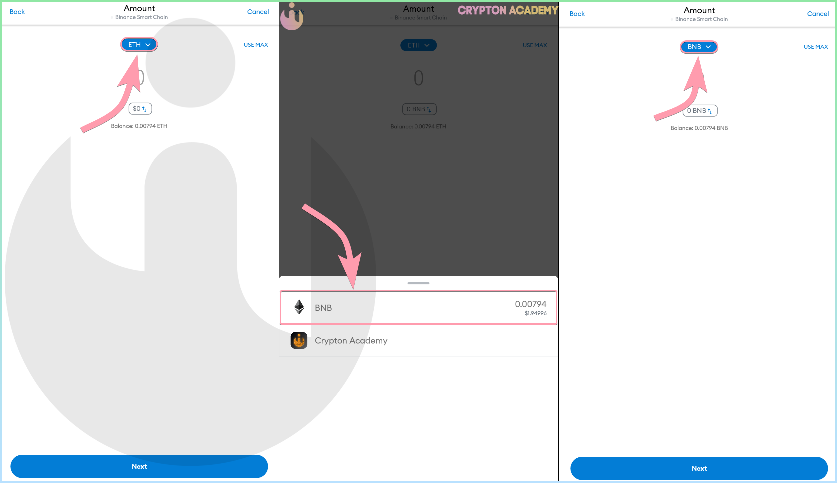 • Если сверху Вы видете ETH, хотя находитесь в сети Smart Chain, не беспокойтесь, это забавный баг приложения, который имеет место быть на момент написания статьи. Подразумевается BNB, Вы можете убедиться в этом, нажав на ETH, в выборе токена для отправки он будет отсутствовать: