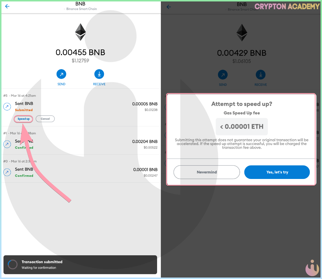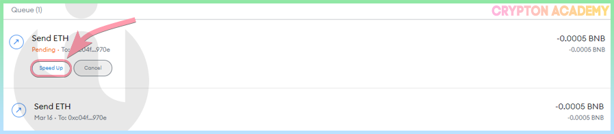 • Отправленную транзакцию можно ускорить, нажав на Speed Up, тем самым увеличив комиссию, или отменить транзакцию, нажав Cancel: