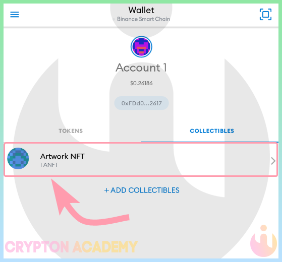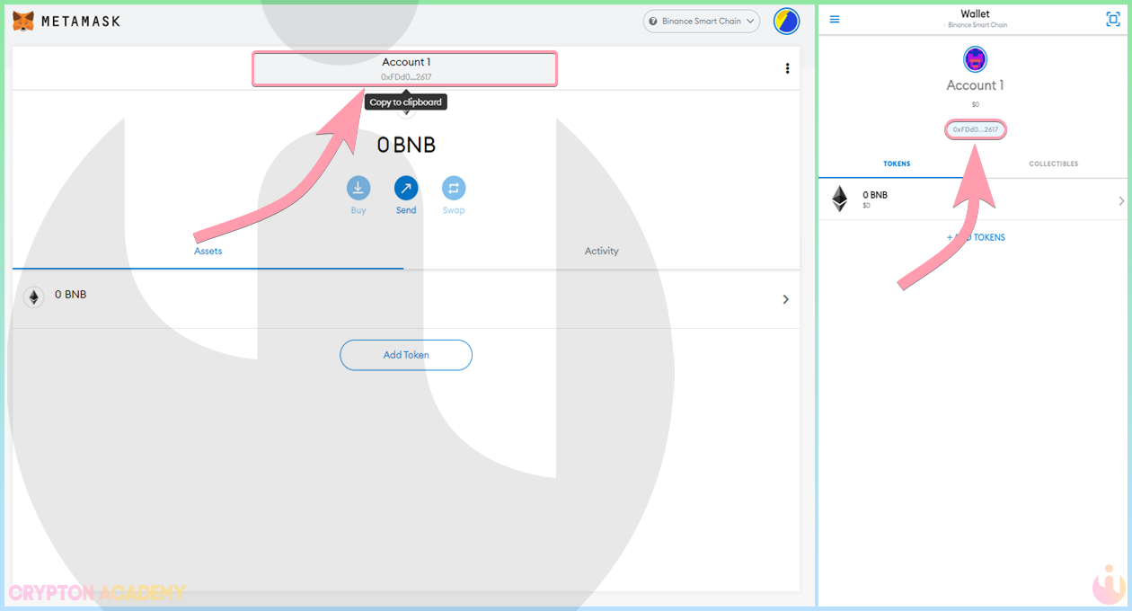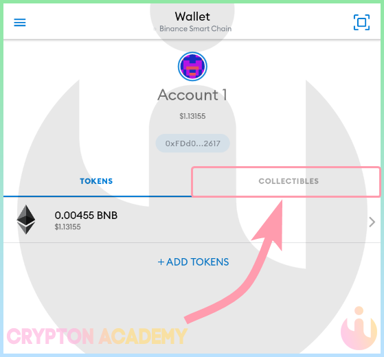 Для получения NFT-токенов используйте Ваш обычный адрес, например, для NFT-токенов в сети Binance Smart Chain используйте Ваш BNB адрес. Его можно скопировать, нажав на него: