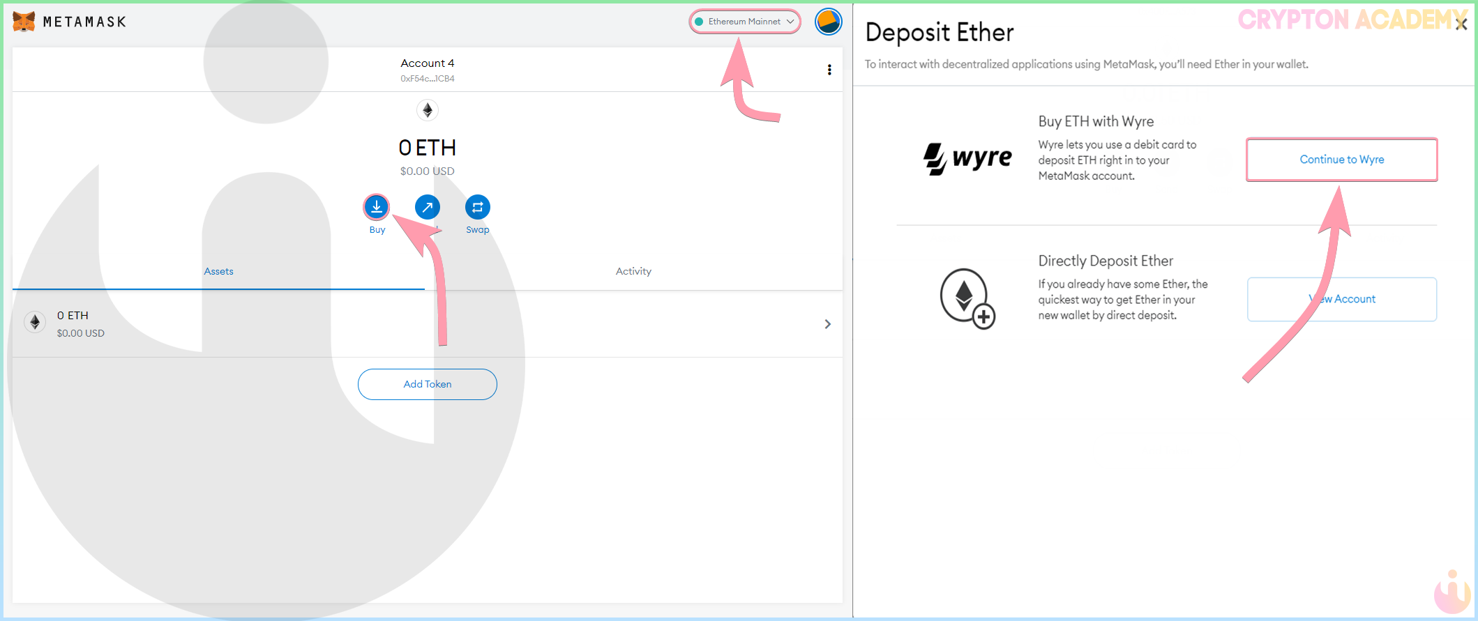 Перейдите в сеть Ethereum Mainnet и нажмите на Buy, Continue to Wyre: