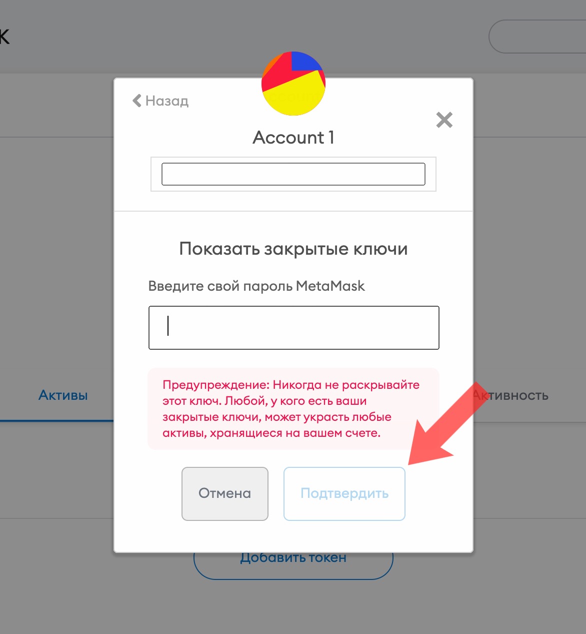 4. Для того, чтобы MetaMask показал вам закрытый ключ, необходимо ввести свой пароль и нажать на кнопку «Подтвердить». После выполнения этих действий, вам будет доступен закрытый ключ вашего счета, который можно без труда скопировать для своих целей.