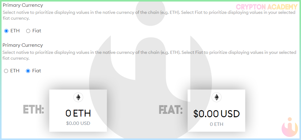 • Здесь же Вы можете сменить основную валюту кошелька — нативная (криптовалюта) или фиатная (в обычных валютах), так это будет выглядеть при выборе каждой из опций: