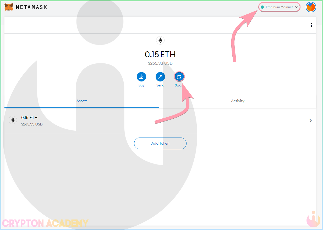 Для того, чтобы совершить обмен, переключитесь на сеть Ethereum Mainnet, если Вы находитесь в другой сети, и нажмите на Swap:
