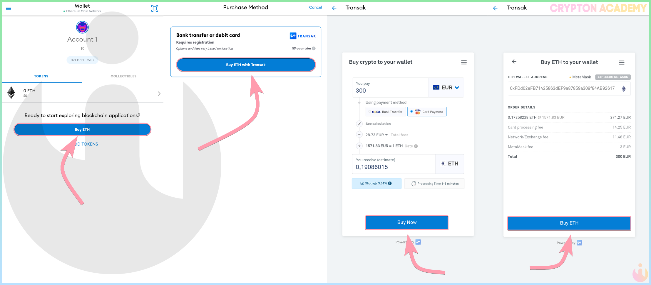 Нажмите на BUY ETH и Buy ETH with Transak, введите желаемое количество для покупки и нажмите Buy Now, Вам покажут детали транзакции, нажмите Buy ETH, подтвердите электронную почту и завершите оплату: