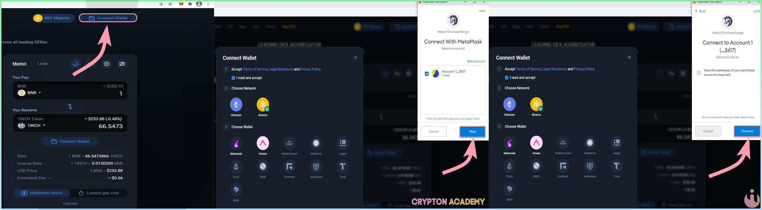 Далее подключите кошелек к приложению, нажав на кнопку по типу Connect (Unlock Wallet, Connect Wallet), в примере я использовал агрегатор dex-обменников 1icnh: