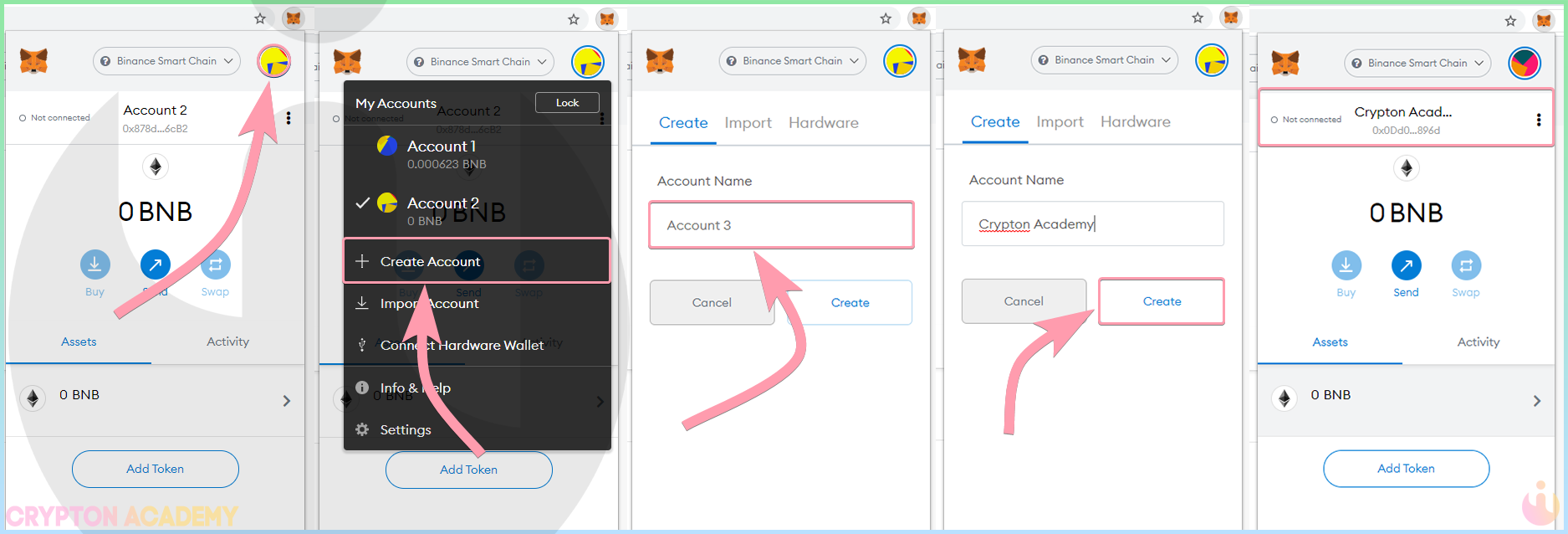If this still sounds confusing, let’s look at an example to understand it better. When you create your first metamask account, you will receive a recovery phrase that you must store securely. And once you have created your first account, if you go to the top right, and click on create account, you can create a new account, usually with the name account2 but you can indicate the name you want.