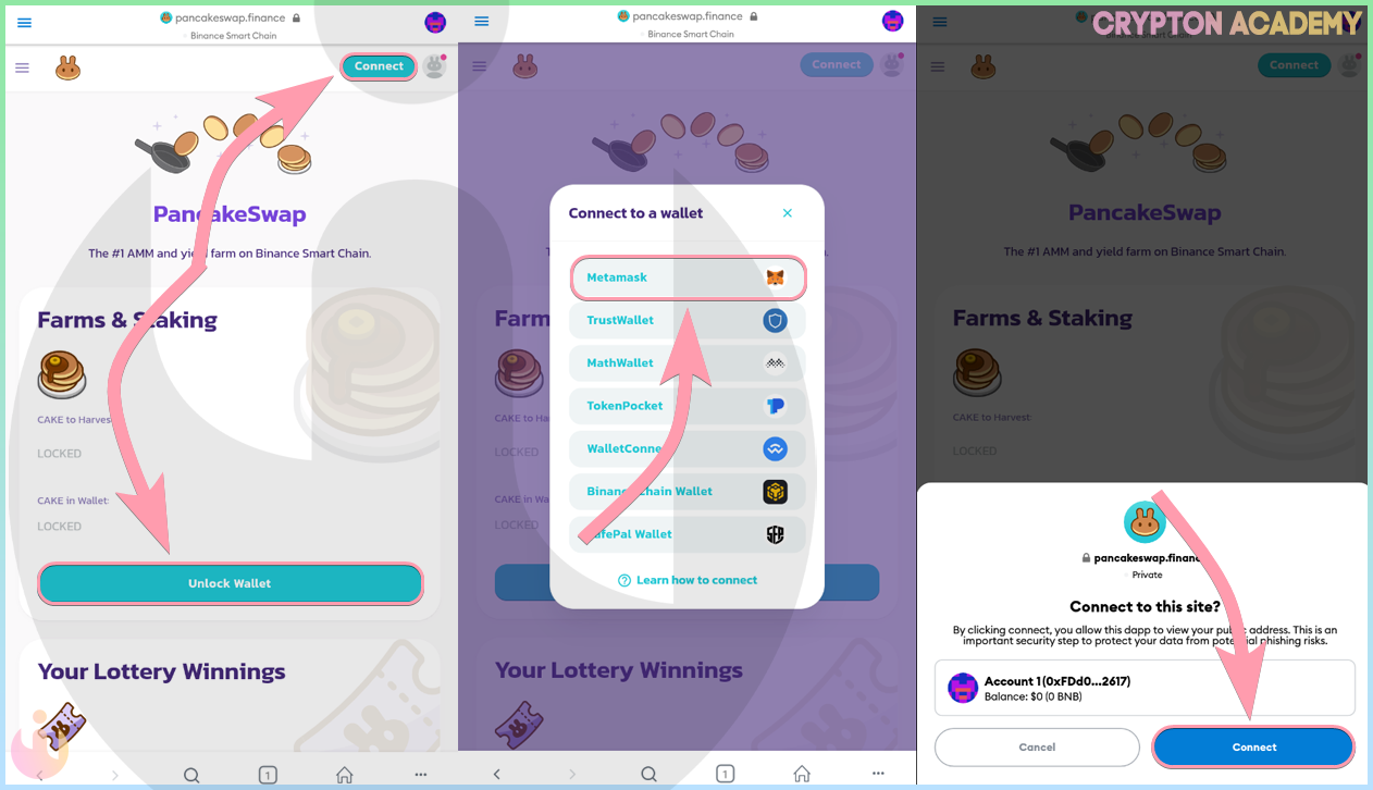 В браузере Вы можете делать множество вещей, например, производить обмены на DEX-обменниках, так будет выглядеть подключение на примере обменника pancakeswap: